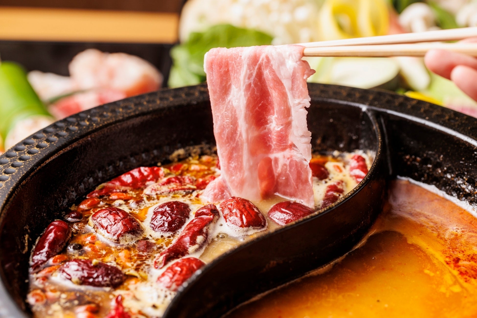唯一無二の魚骨スープと、魅惑の旨辛スープから成る二食鍋。