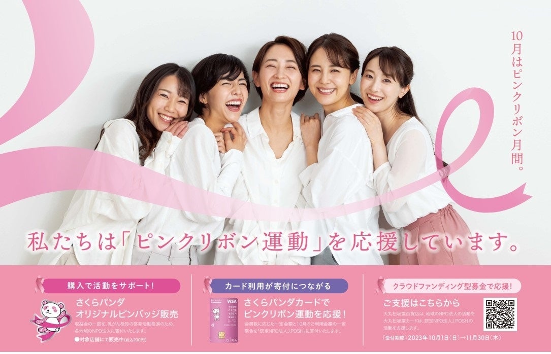 会員様の約8割が女性であり、従業員の約7割が女性である大丸松坂屋カードは「大切なお客様をはじめ、すべての女性に、いつまでも健康で素敵な人生を過ごしていただきたい」という思いから、CSR活動の一環としてピンクリボン運動の啓発活動に参加し、認定NPO法人J.POSH(日本乳がんピンクリボン運動)を通じて応援してまいります。