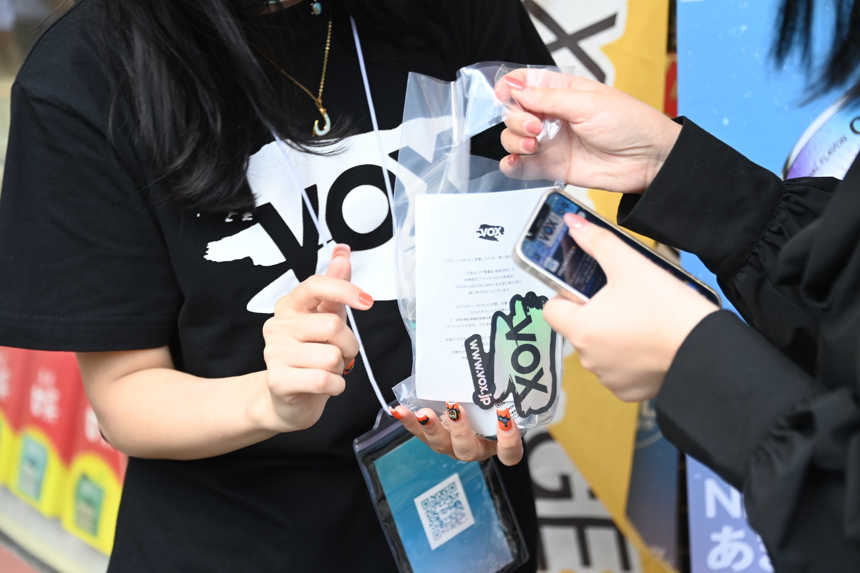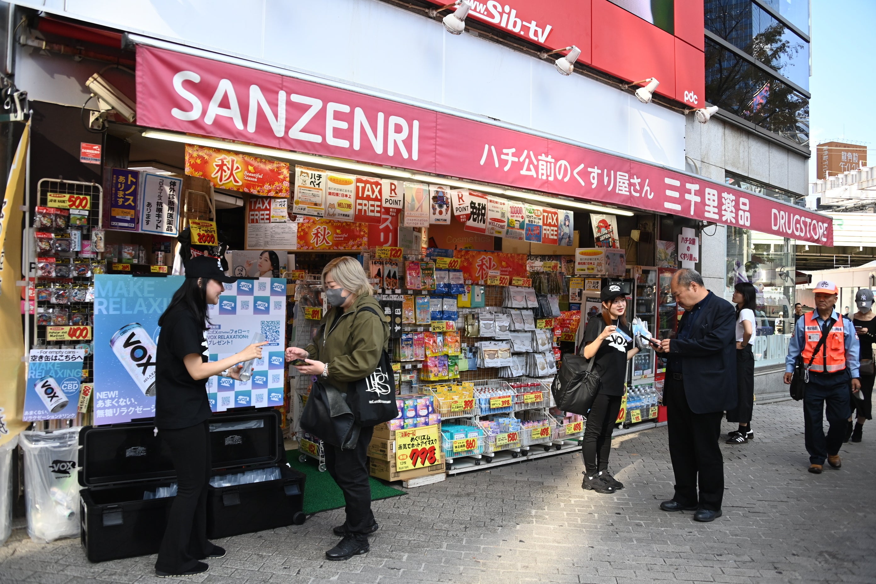 2023年10月24日(火)に発売されたCBD10mg配合のリラクゼーションドリンク「VOX RELAXATION」をいち早く体感いただくため、VOXでは渋谷スクランブル交差点近くの「三千里薬品 神南店」前で発売当日にサンプリングイベントを実施。午後一番の時間帯からVOX RELAXATION 1本とVOXオリジナルステッカーなどが入ったトライアルセットの配布をスタートしましたが、終了予定時刻前に用意したトライアルセットが底をつき、予想以上のスピードでイベントは終了いたしました。