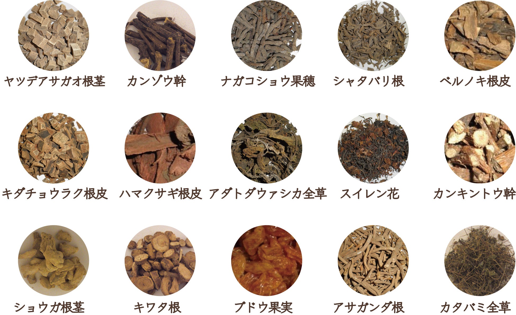 アムラ(バングラデシュ産)、ヤツデアサガオ、カンゾウ、ナガコショウ、シャタバリ、アサガンダ、ベルノキ、アダトダウァシカ、ケブラ・ペドラ、ブドウ、カンキントウ、フェヌグリーク、ショウガ、キワタ、カタバミ、キンバイザサ、ハマビシ、ナンバンサイカチ、木胡蝶、キダチヨウラク、ステレオスペルマム、タイワンウオクサギ、タマツナギ、オオバフジボグサ、モスビーン、テラムナスラビアリス、テンジクナスビ、キミノヤマホロシ、ハゼノキ、サンナ、ナハカノコソウ、スイレン、コウキシタン、マルバノホロシ、着生蘭、カルダモン、セイロンテツボク、セイロンニッケイ、タマラニッケイ、エラグ酸(植物由来)、はちみつ