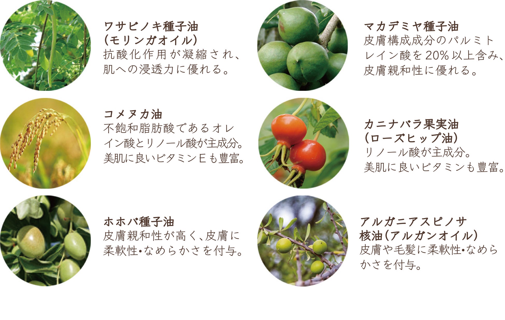 ホホバ種子油:皮膚親和性が高く、皮膚に柔軟性・なめらかさを付与。