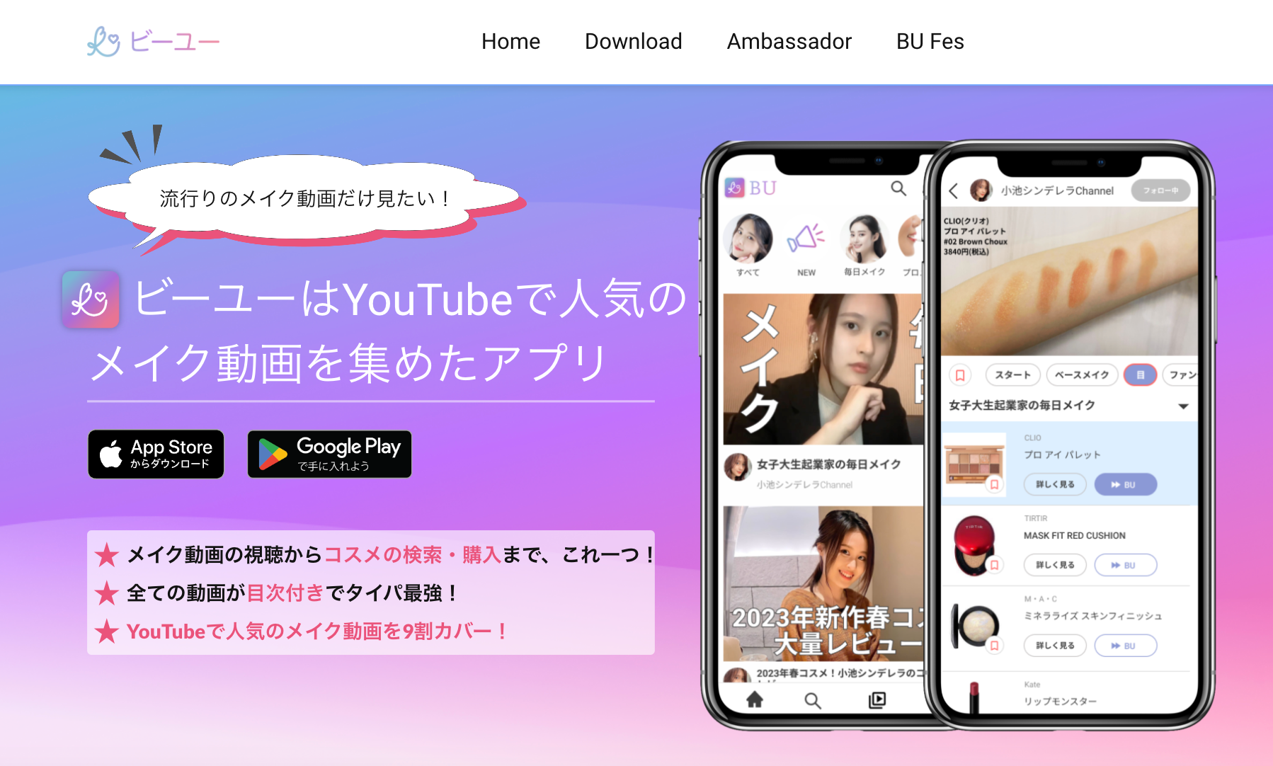 「ビーユー」は本イベント主催の株式会社Cinderelaxが運営する、「メイク動画を革新的に見やすくするアプリ」の名称です。