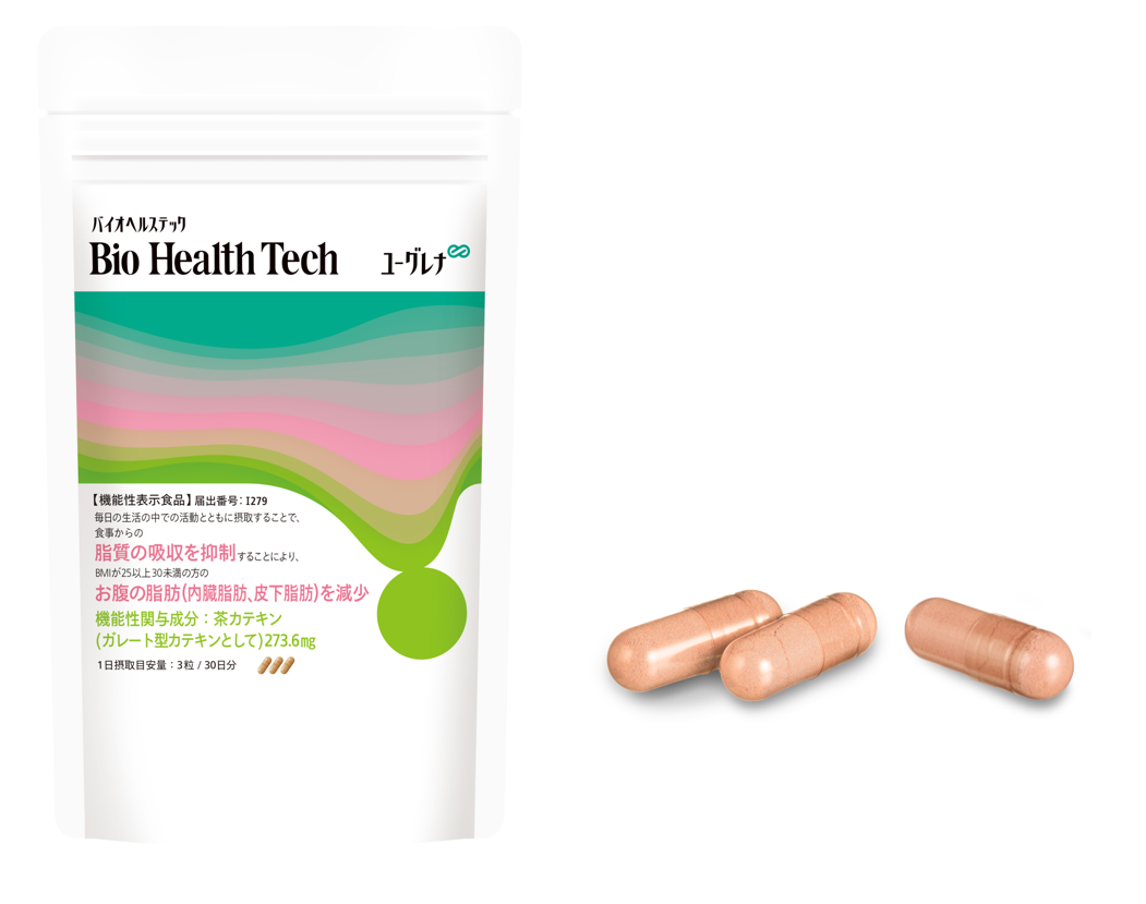 当社の『ユーグレナBio Health Tech(バイオヘルステック)』は、お客様のもつ様々なお悩みにアプローチする有用成分を、各商品に可能な限り高濃度・高配合処方した、ウェルエイジングを実現するためのサプリメントシリーズです。今回第四弾として、生活習慣でお腹の脂肪が気になる方向けに、機能性関与成分「ガレート型カテキン」を高濃度に凝縮し、飲みやすさにこだわったサプリメントタイプの機能性表示食品を発売します。