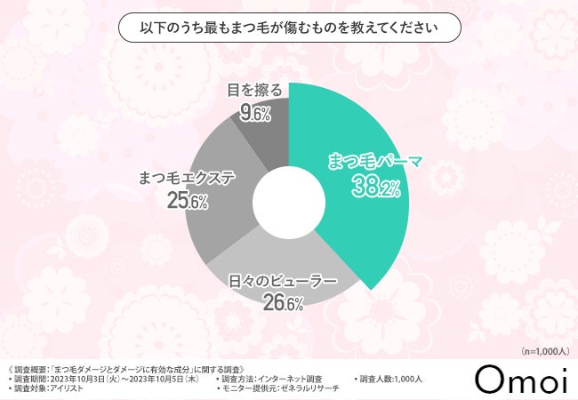 「以下のうち最もまつ毛が傷むむものを教えてください」と質問したところ、『まつ毛パーマ(38.2%)』と回答した方が最も多く、次いで『日々のビューラー(26.6%)』『まつ毛エクステ(25.6%)』『目を擦る(9.6%)』と続きました。