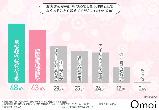 「お客さんが来店をやめてしまう理由として考えられることを教えてください(複数回答可)」と質問したところ、『まつ毛へのダメージ(48.4%)』と回答した方が最も多く、次いで『施術価格が高い(43.4%)』『仕上がりがイメージと異なる(29.7%)』『通うのが面倒(25.9%)』『アイリストへの不満(24.8%)』と続きました。