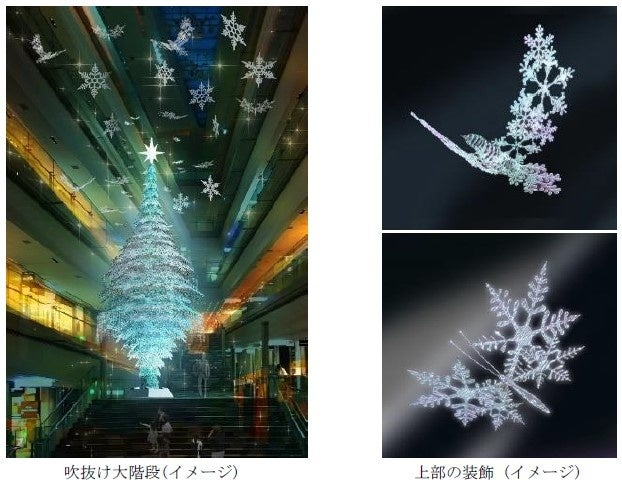 吹抜け大階段の上部には、ツリー同様に3Dプリンターで作られた鳥や蝶などをモチーフとしたクリーチャー(空想上の生き物)や、ツリーでも用いられた雪の結晶をディスプレイ。クリーチャーの体の一部は結晶体となっており、ツリーの照明に呼応しながら、優しく光り輝きます。