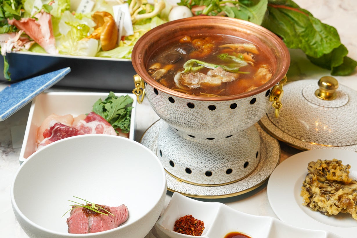 コース内容は種類豊富に取り揃えた“きのこ”と微生物活性農園のプロラボファームで育てた“野菜”をふんだんに使用した「キノコ&野菜しゃぶしゃぶ」をメインに、「ジャンボキノコの丸ごとオーブン焼き」や抗生物質を使用せず育てた黒毛和牛を使用した「麻布 肉しゃり監修 都萬牛の究極の〆ご飯」など、贅沢なメニューをご用意しています。メインのベースとなる「究極の金のデトックススープ」には、プロラボファーム野菜と昆布などでだし汁を取った無添加の凝縮スープが使用されます。コースメニューが進んでいく過程で、しゃぶしゃぶをする具材のエキスや数種類の調味料が重なり合い、味わい深い自分だけのオリジナルスープを作ることができるので、美味しく楽しく菌活をしていくことができます。
