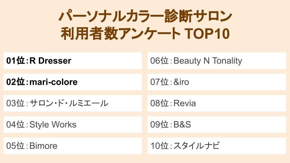東京でパーソナルカラー診断サロンを利用したことがあると回答した793人に、利用経験のあるサロンを尋ねたところ、1位はスクールで講師も務める小川さんが運営する「R Dresser」、2位はファッションプロデューサーのmaricoさんが運営する「mari-colore」、3位は20年以上の歴史のある「サロン・ド・ルミエール」でした。