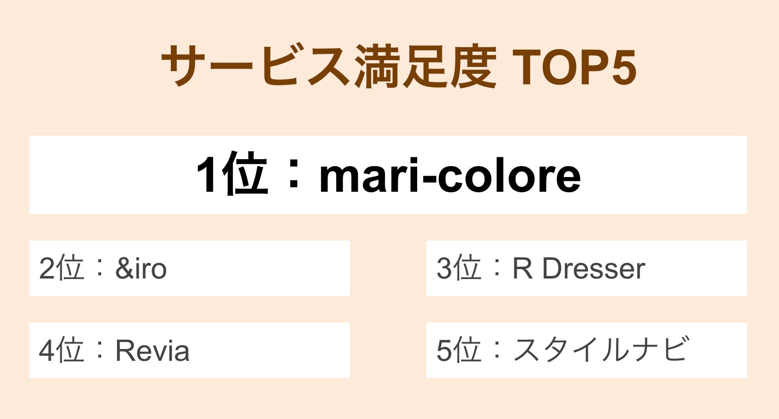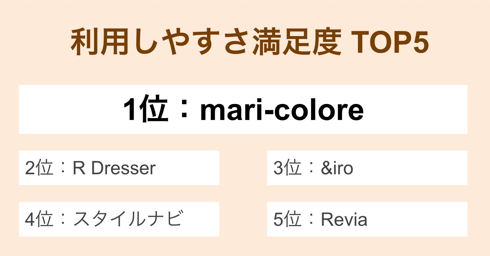 アクセスの良さ、イメージコンサルタントの幅広さ、指名可能かどうか、予約後のやりとりなどの部分で最も利用しやすいと評価されたのは「mari-colore」でした。