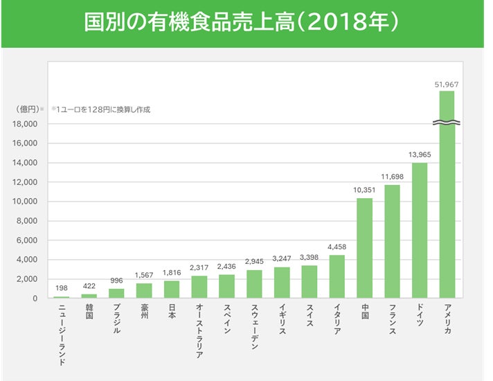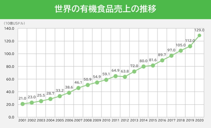 必要性が広く認められるようになりつつあるプロテインですが、これからのプロテイン製品に対して求められる条件としてもう一つ、重要視される項目があります。それが安心できる品質であること。その一つとして「有機JAS認証を取得したオーガニック製品であること」は重要なポイントです。世界的に見てもオーガニック食品の売上高は右肩上がりの一途を辿っており、日本はまだまだオーガニック先進諸国に対して遅れをとっていますが、それでもこの流れに乗っていることは明らかです。