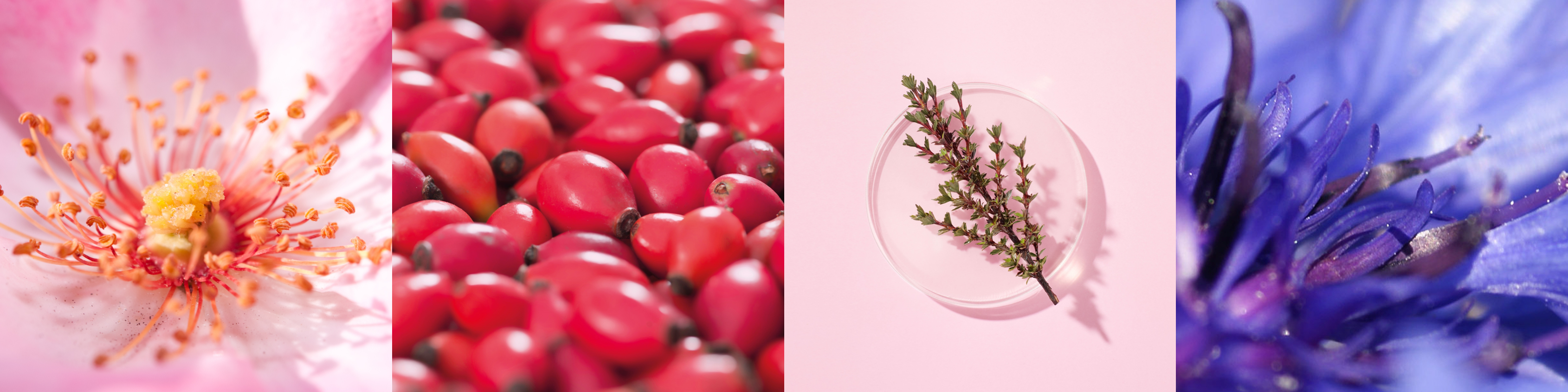 左からワイルドローズ*³、ローズヒップ*⁴、復活草*⁵、コーンフラワー*⁷