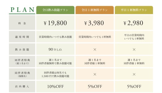 なお、料金は全て1杯800円ですが、「全日飲み放題プラン(19,800円)」「全日1杯無料プラン(3,980円)」「平日1杯無料プラン(2,980円)」の3種類のサブスクリプション型料金プランのいずれかを契約することでお得に楽しんでいただくことができます。