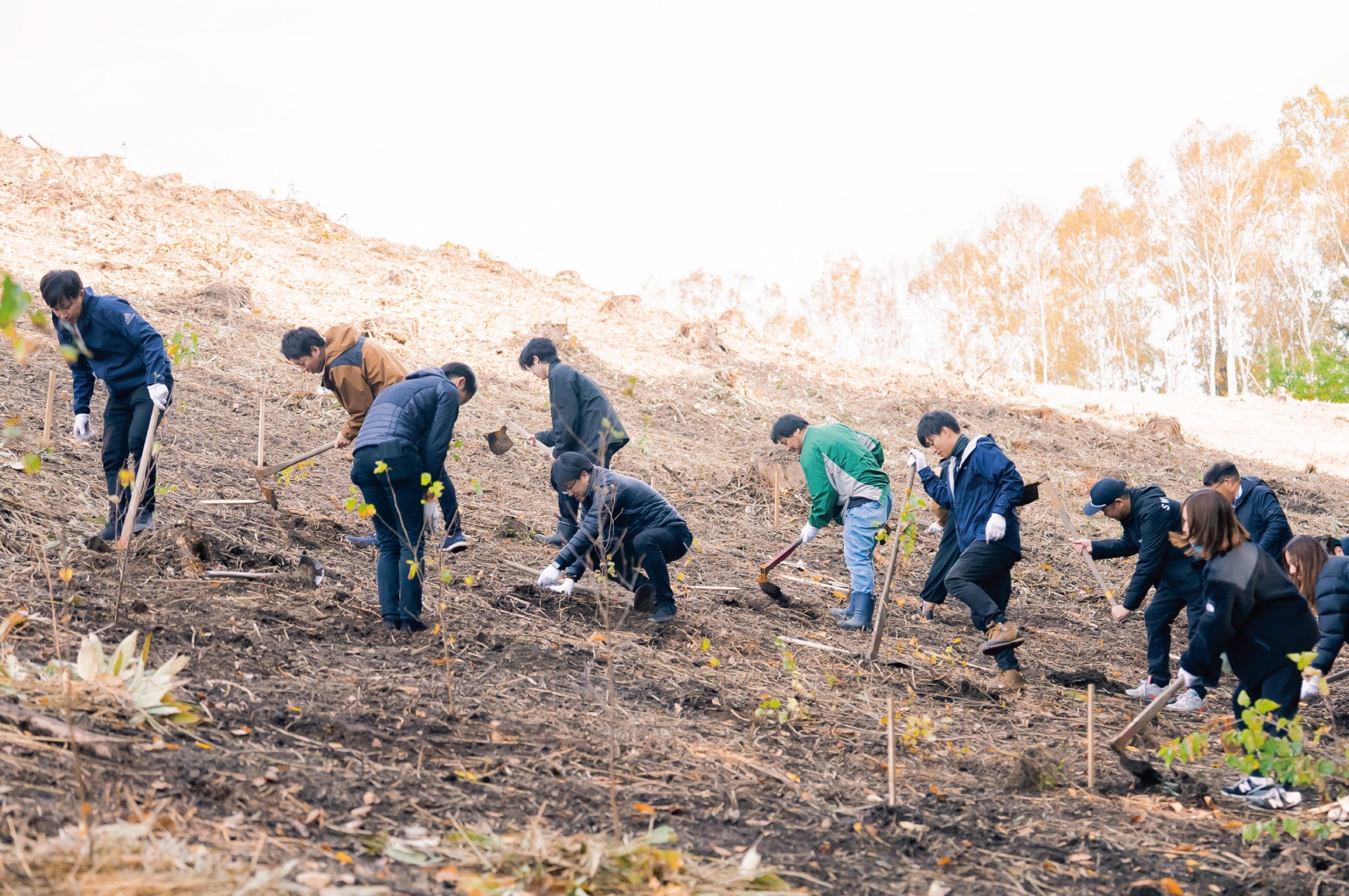整地した斜面にBOTANIST、サツドラ、more treesのプロジェクトメンバーが植林をおこないました。