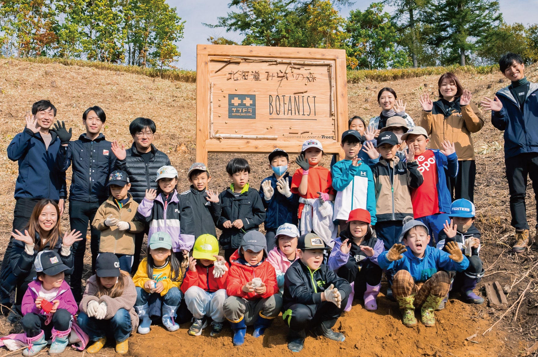 森づくりには、昨年から美幌町立旭小学校の子どもたちに参加いただいています。 「地元の森を、自然を、もっと好きになってもらいたい。」「森や自然が身近にあることを、誇りに感じてもらいたい。」そのような想いで、BOTANISTとサツドラ、more treesは、森づくりのプロセスを通じて様々な自然体験や学びの機会を子どもたちに提供しようと考えました。
