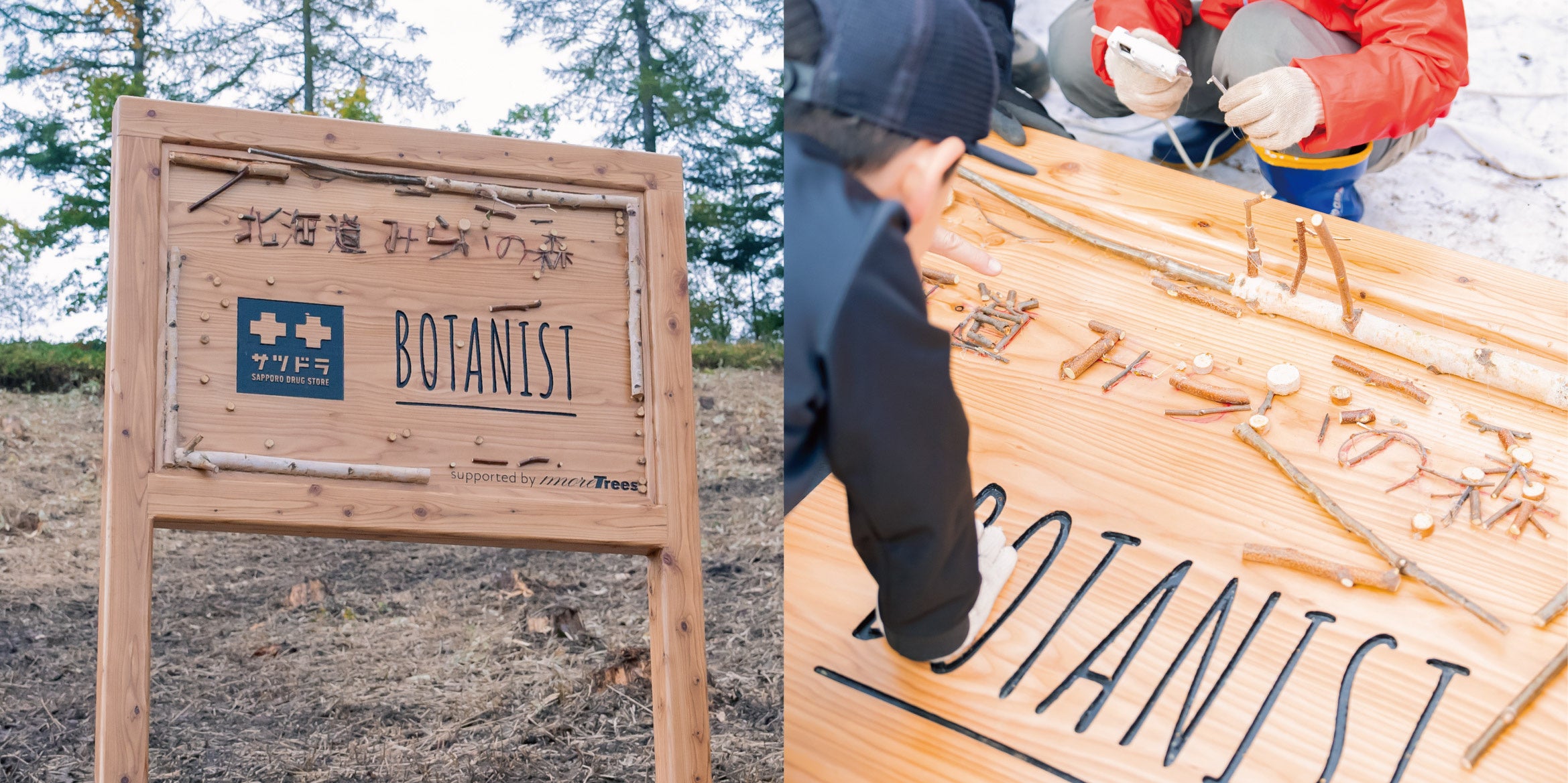 サツドラとの『WITH THE FOREST PROJECT』に向けて、子どもたちに看板づくりを手伝っていただきました。白樺などを使ってデコレーションした、創造性豊かな看板はとても素敵に仕上がりになりました。BOTANISTブランドマネージャーの小林は「植物と共に生きることが好きな人を増やすのも、私たちの役目だと思っています。この活動を通じて、子どもたちにもそうなってもらえれば嬉しいですし、楽しかった思い出が付随するブランドにしていきたい。」と話します。