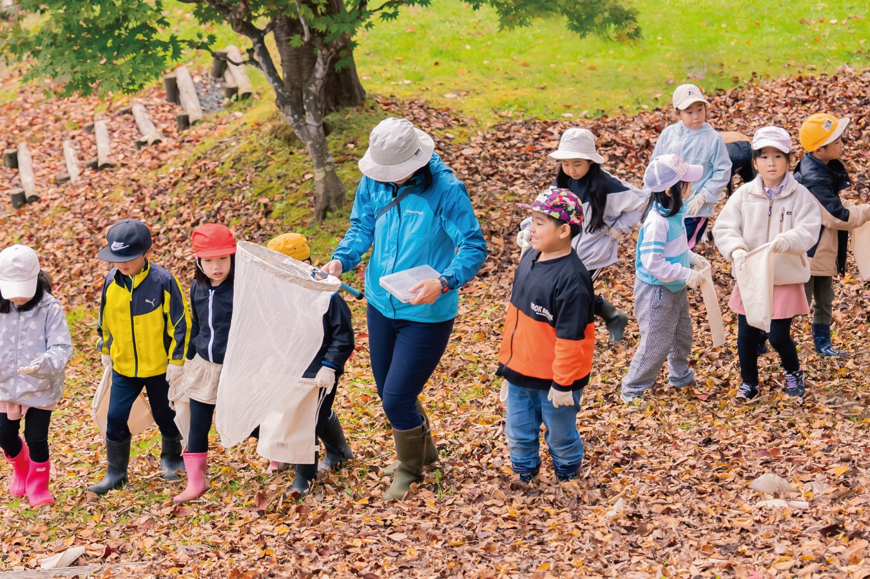 子どもたちは目を輝かせながら、一生懸命に種を拾ったり、時には落ち葉でお面をつくったりと、自然とのふれあいを体験しました。拾った種は小学校に持ち帰って子供たちが苗木になるまで育てます。昨年に拾った種も順調に成長し「みんなが愛着を持って育ててくれています。」と、校長の池田潤氏がお話されていました。
