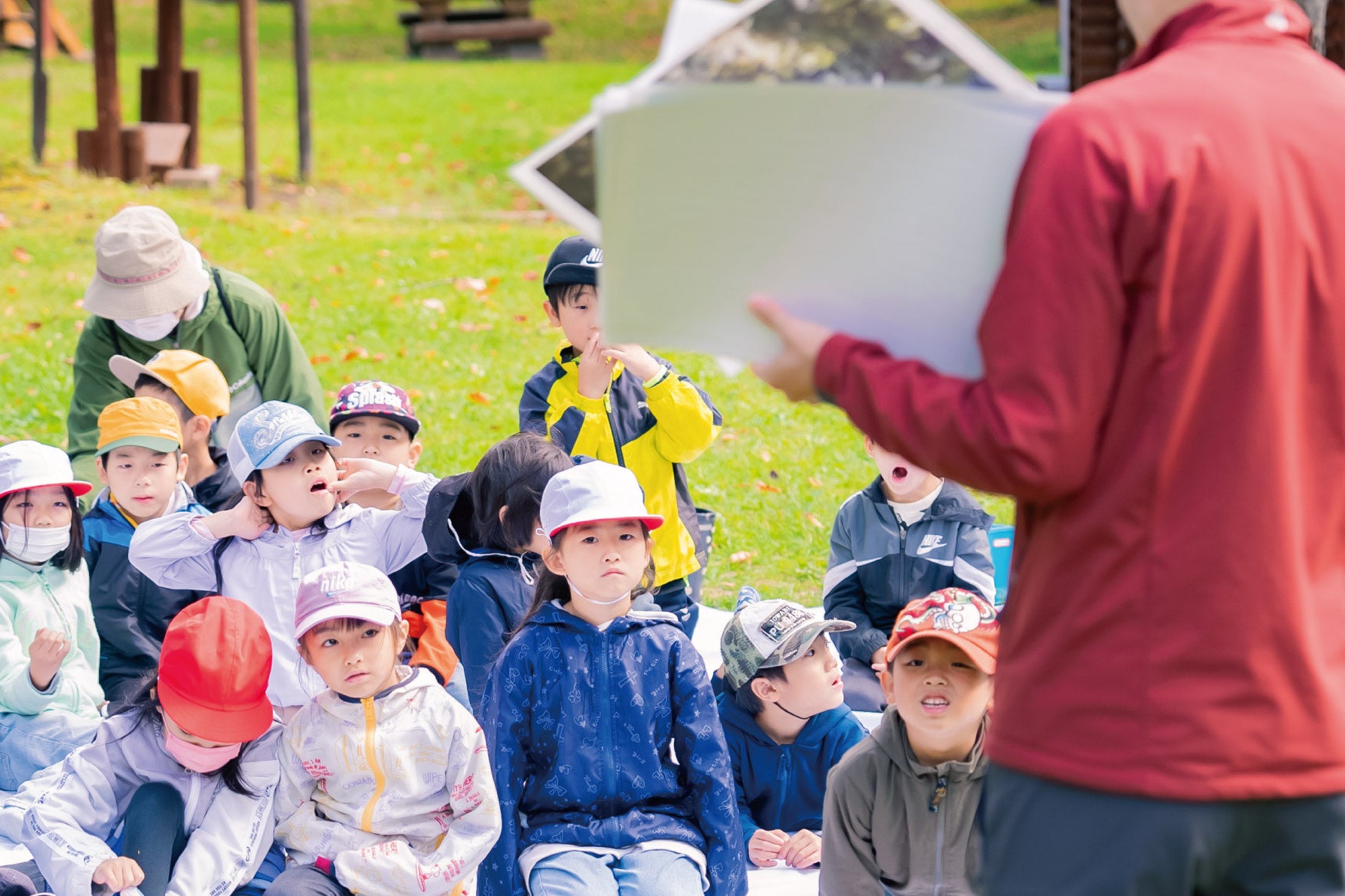 more treesの岸氏が日本や世界の森の状況、多様性のある森づくりの必要性を紙芝居形式で伝えることから始まり、BOTANISTブランドディレクターの東野が活動の全容をまるで絵本を読むように話していきます。子どもたちも真剣な眼差しで、初年度に植林した苗木が3メートル以上に成長している話を聞くと、「森も生きているんだね!」「木を育てたい!」と、素敵な言葉を発する場面もありました。