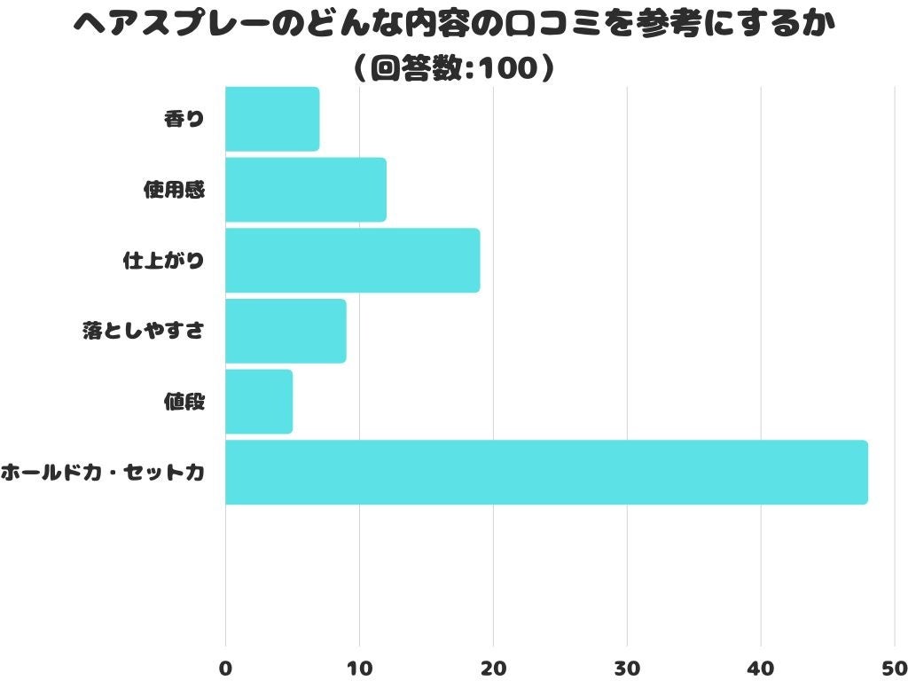 ヘアスプレーのどんな内容の口コミを参考にするかをアンケートにて調査したところ、1位は「ホールド力・セット力」でした。