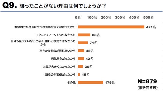 一方で譲ったことのない方は妊婦の方が付近に立つ状況が今までなかったからという方が多く、またマタニティマークを知らなかったからという方も10%おられました。