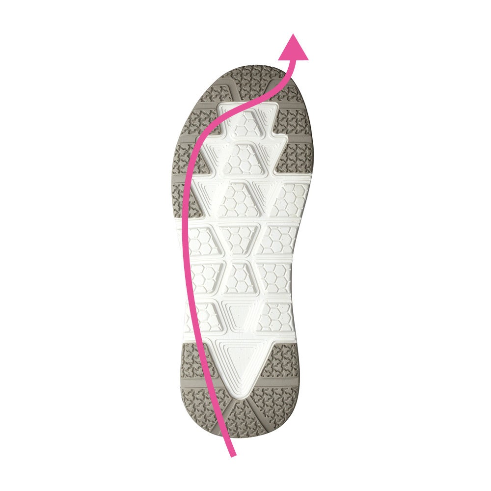 かかとから着地し小指から親指へと歩行時の重心移動をサポートするアウトソール。