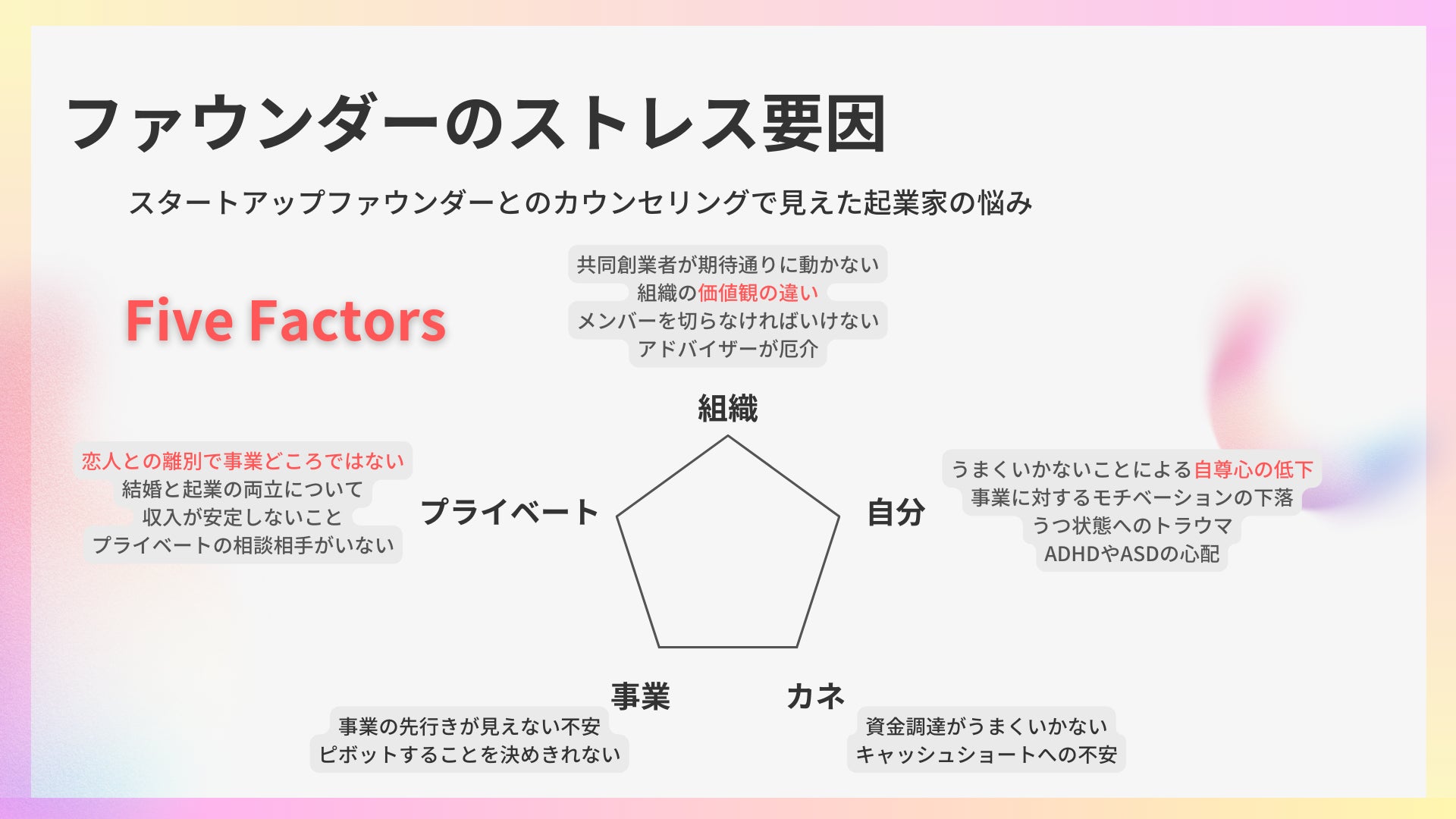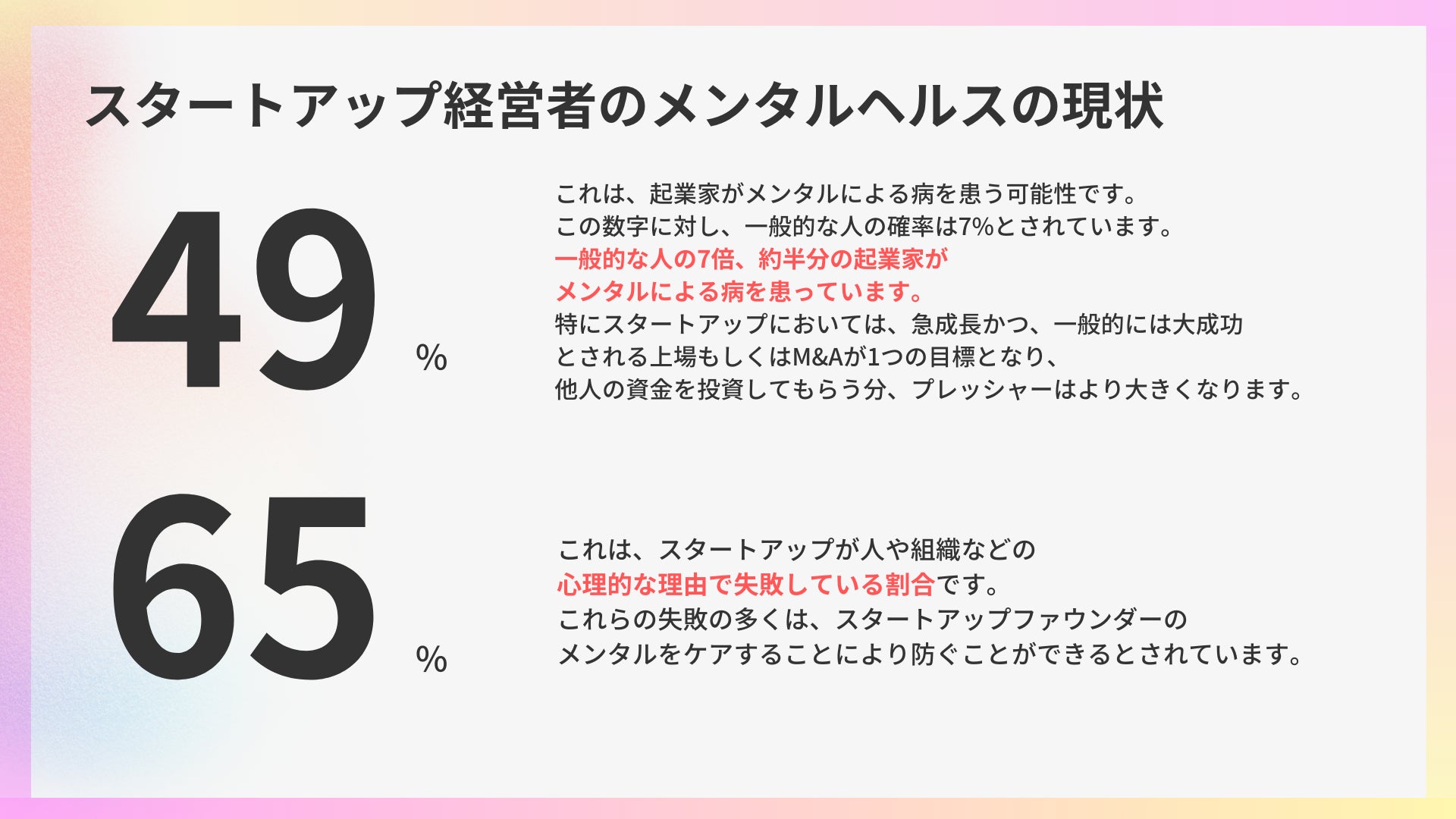 しかし、いくら起業しやすい環境を整えても、起業家が孤独感やストレスなどの多くの課題を乗り越えられなければ、国際社会に通用するスタートアップを創出することはできません。また、“起業家”の実態を知らずに軽い気持ちで起業する人が増え、その結果精神疾患を抱える人が増えてしまっては、かえって日本社会の衰退につながってしまいます。