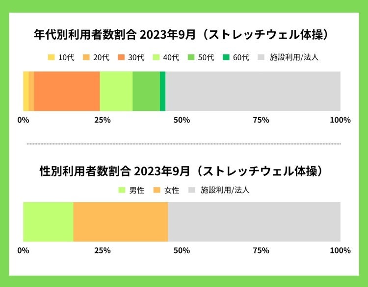 MIRROR FIT. ではコンテンツ利用時間は夜の時間帯が多い傾向にある中、「ストレッチウェル体操」は平日午前7時台がもっとも多く利用されています。また、利用者の年代は30代がもっとも多く、出勤前などの毎朝のルーティンにしていることが考えられます。