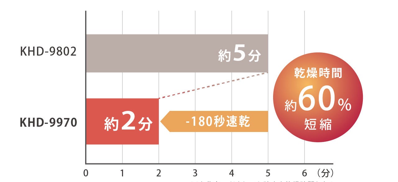 (※1)【試験方法】毛束の水分率が15%を切った時点の乾燥時間を測定比較(比較機:KHD-9802)