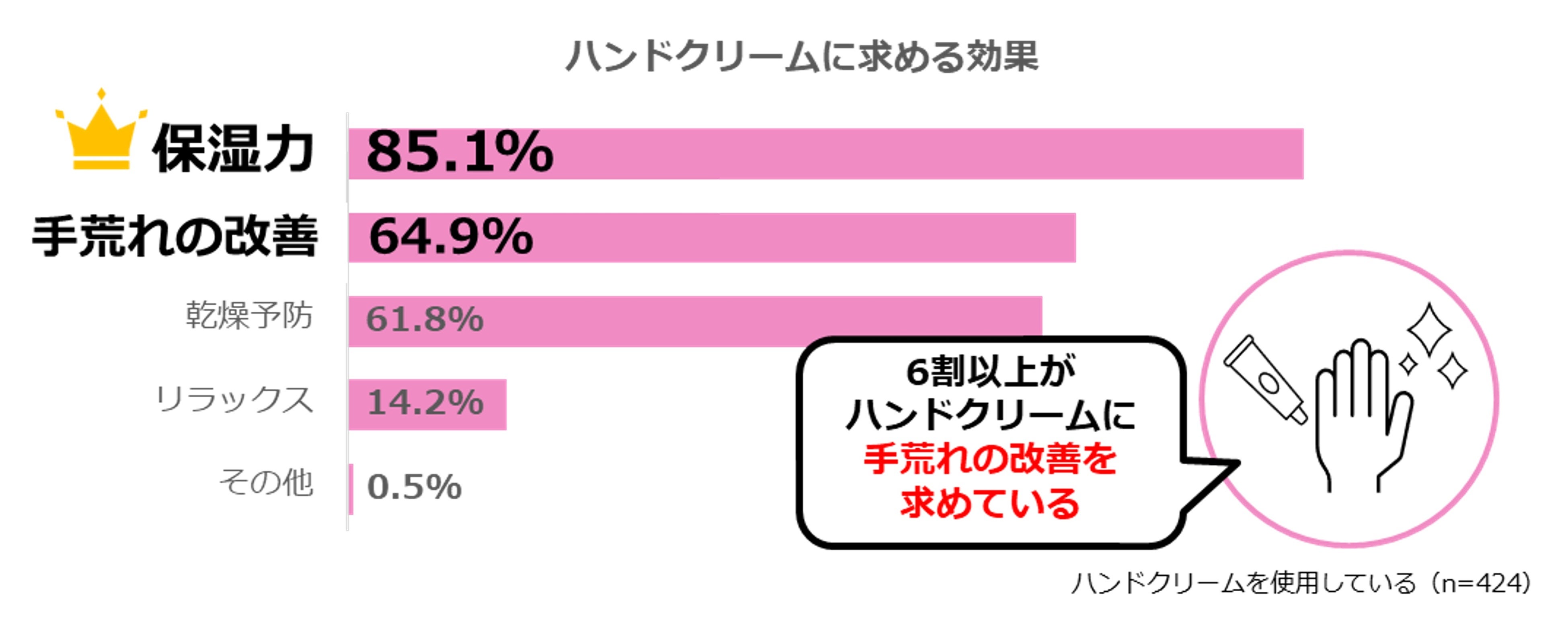 ハンドクリームに求める効果をきくと、85.1%が「保湿力」と回答した一方、「手荒れの改善」と回答した人も64.9%いることが明らかになりました。保湿効果だけでなく、手荒れを“治す”ことを目的としてハンドクリームを使用する人も多いことがうかがえます。