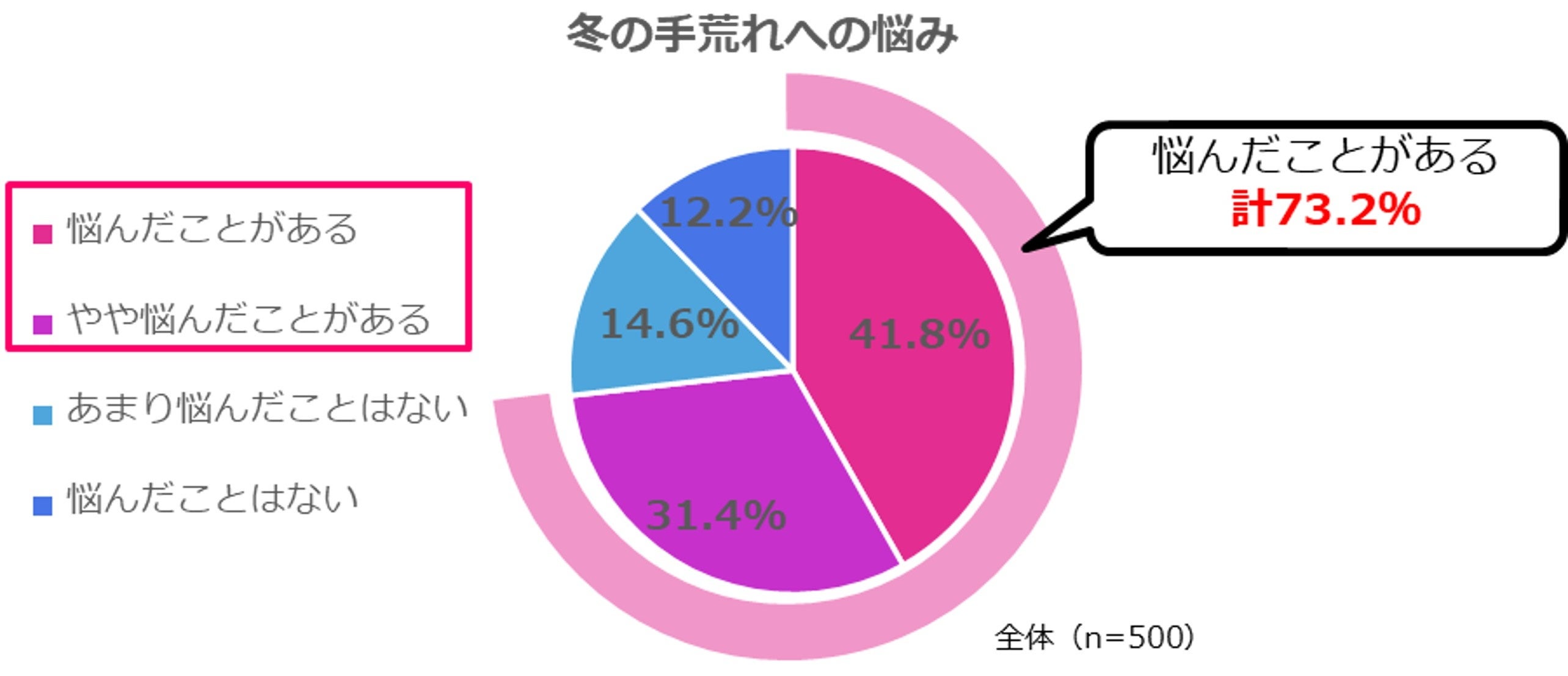 ① 冬の手荒れに悩んでいると73.2%が回答。