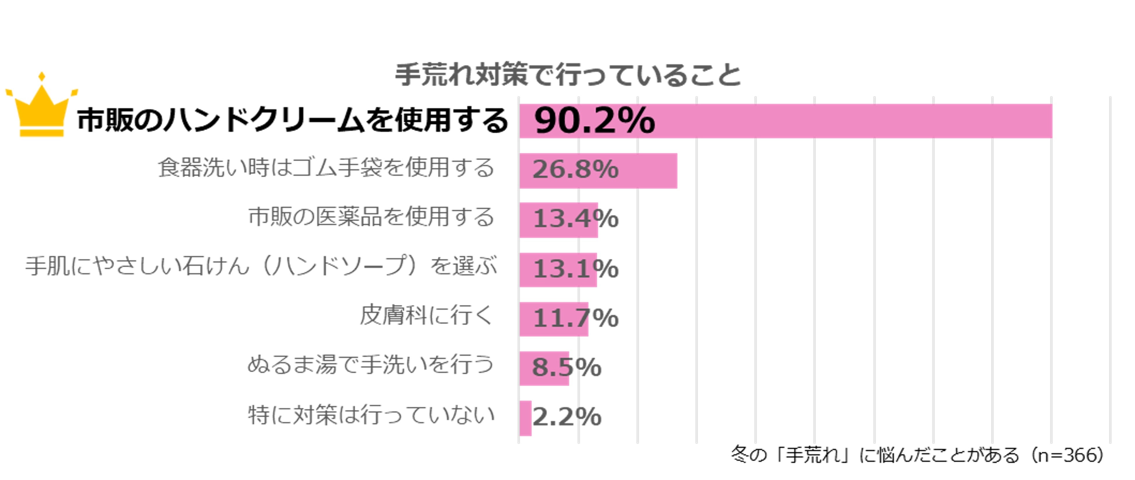 手荒れに悩んだことがある人の90.2%が、手荒れ対策として「市販のハンドクリーム」を使用していると回答。「食器洗い時はゴム手袋を使用する(26.8%)」「市販の医薬品を使用する(13.4%)」などハンドクリーム以外の対策を回答する人は少なく、ハンドクリームが手荒れ対策の定番となっていることがうかがえます。