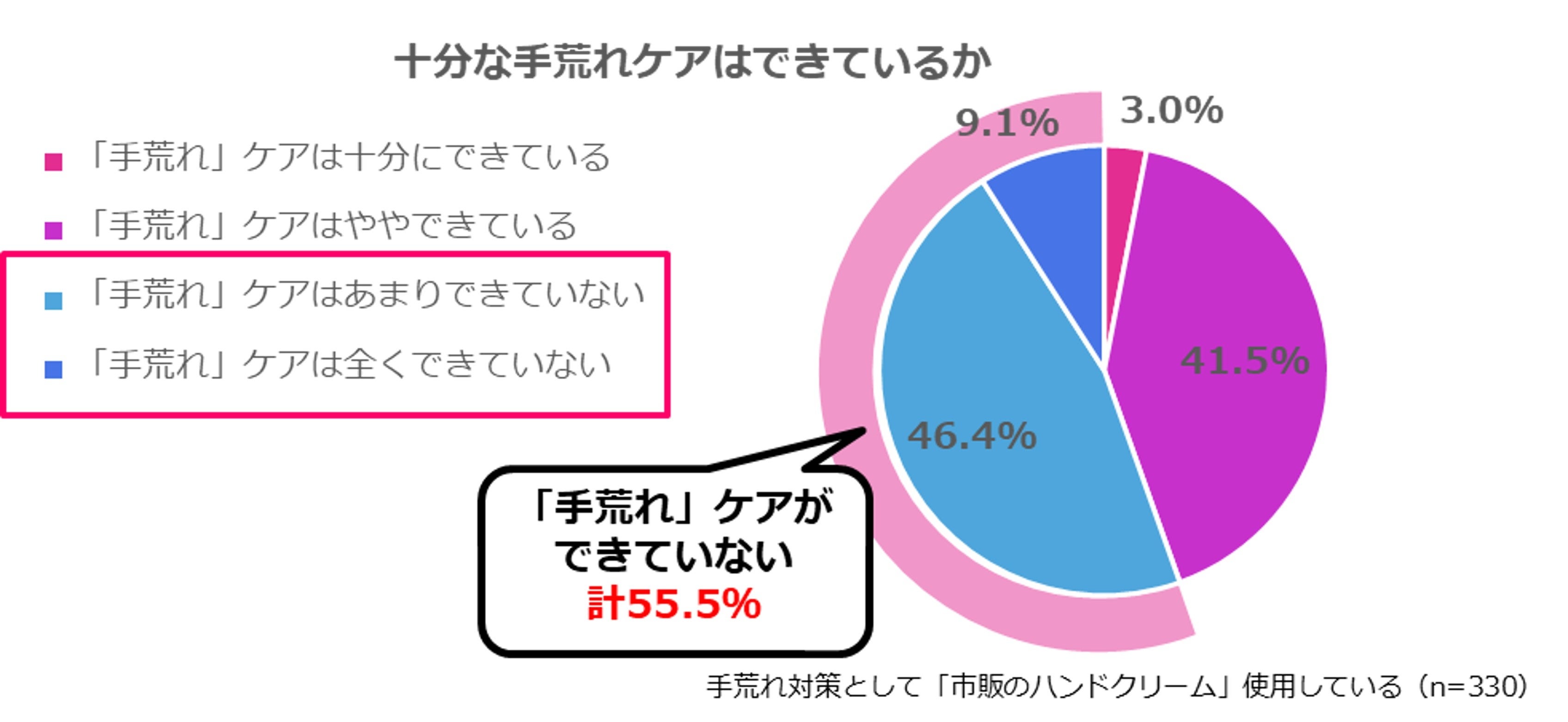 また、市販のハンドクリームを使用している人に、十分な手荒れケアができているかを聞くと、「あまりできていない(46.4%)」「全くできていない(9.1%)」という結果となり、市販のハンドクリームで十分なケアができていないと感じている人は半数以上(55.5%)にのぼることが判明しました。