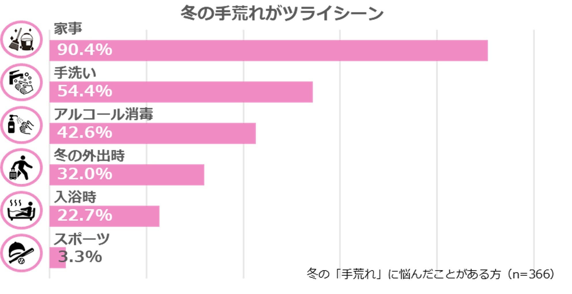 「冬の手荒れがツライシーン」を聞くと、「家事」が最も多く、全体の90.4%が回答。続いて「手洗い(54.4%)」、「アルコール消毒(42.6%)」がツライという結果に。