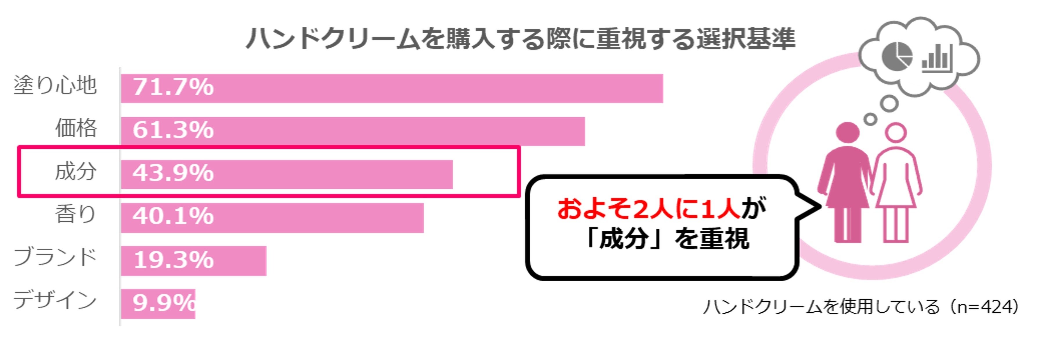 ハンドクリームを購入する際に選択基準を聞くと、1位「塗り心地(71.7%) 」、2位「価格(61.3%) 」、3位「成分(43.9%) 」という結果に。「成分」をハンドクリームの選択基準にしている人が、およそ2人に1人いることが判明し、ハンドクリームも「成分」を重視する人が多いことが明らかになりました。