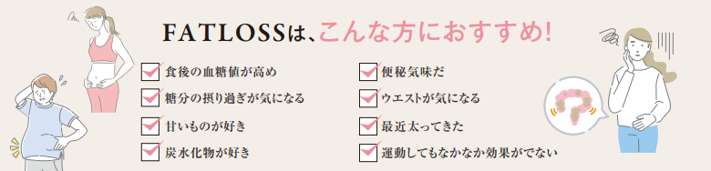 この度発売いたしました「FATLOSS」は4つの成分が皆さまのキレイをお手伝いするサプリです。