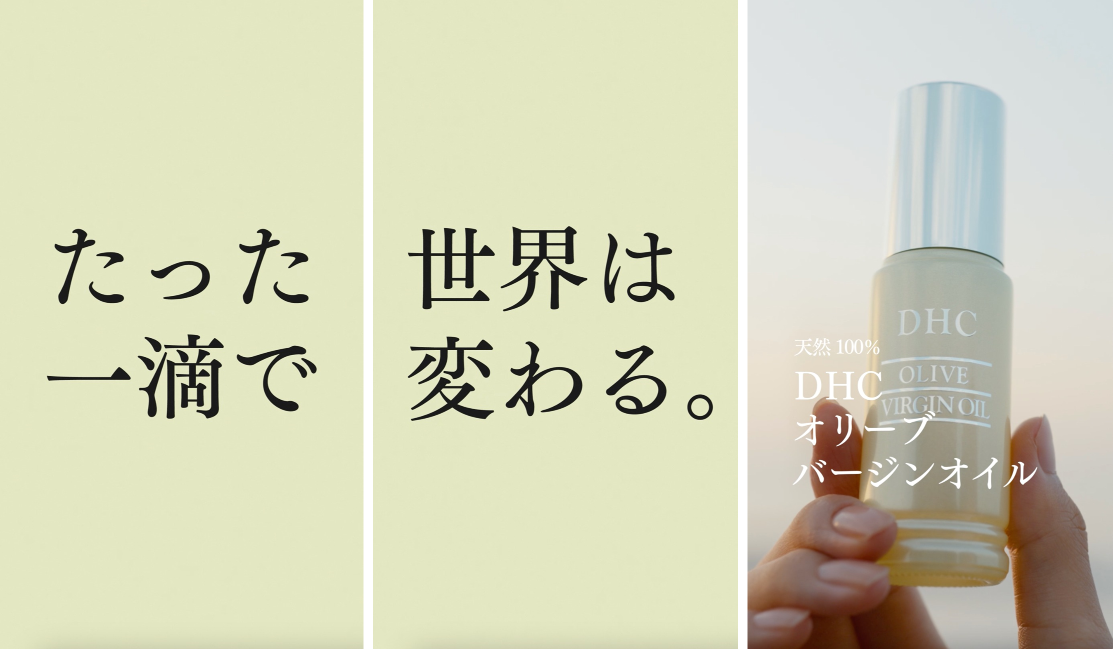 「たった一滴で、世界は変わる。」のコピーを冒頭に露出した後に、オリーブの一滴をクローズアップします。しずくの中にスペイン・アンダルシアのオリーブ畑の風景が広がると、その畑で育ったみずみずしい1粒のオリーブの実からしずくが滴り落ち、1人の女性が潤いを実感するカットに移ります。その後、様々な場面で実感いただける様子を映しながら、「DHCオリーブバージンオイル」の使い心地の良さとブランドの世界観を表現した作品になっています。