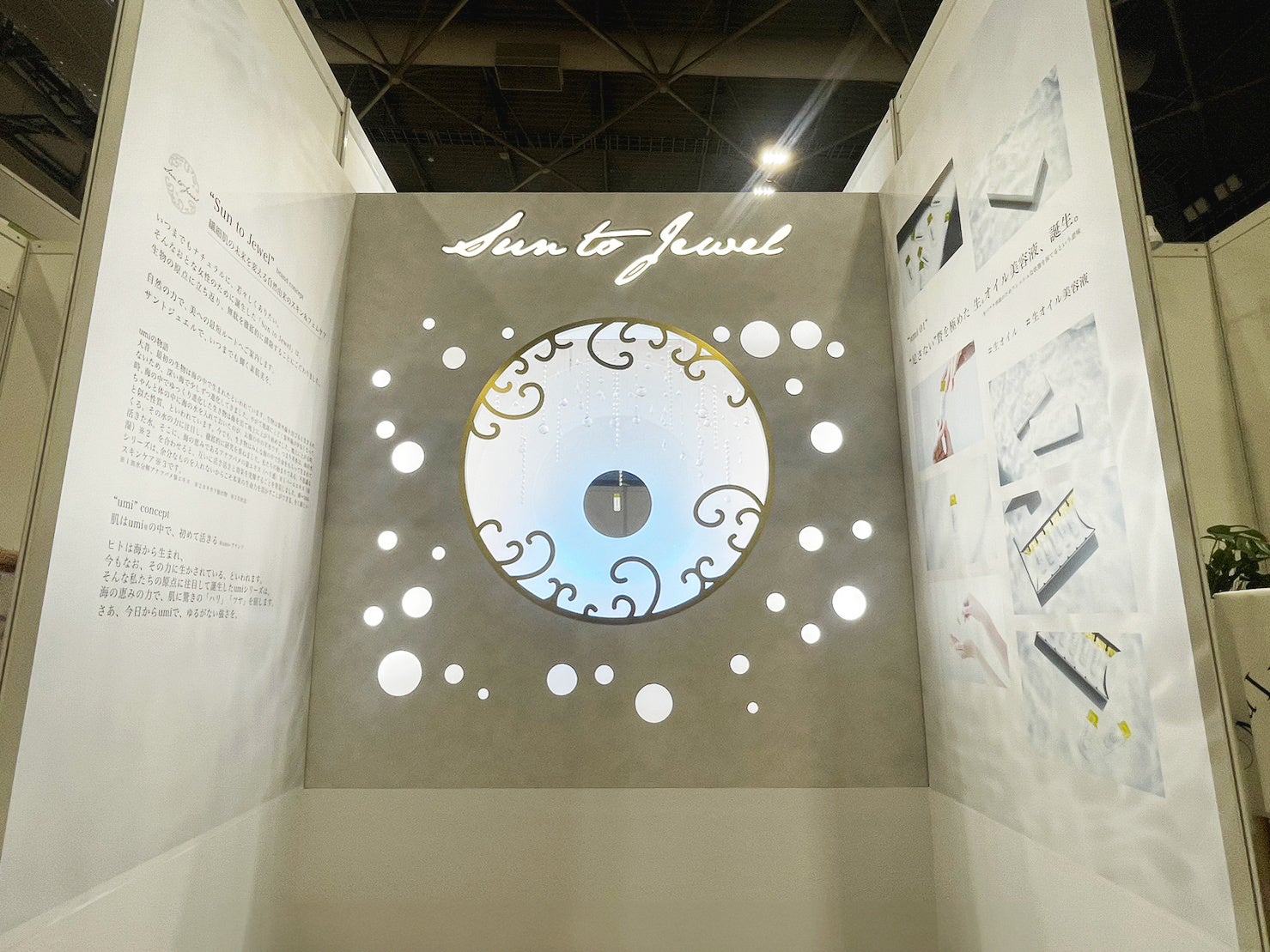 ブースは、サントジュエルのロゴフレームの中に日光があたり、キラキラと輝く海の中を表現し、奥行きのある他にはない神秘的なデザインで制作いたしました。
