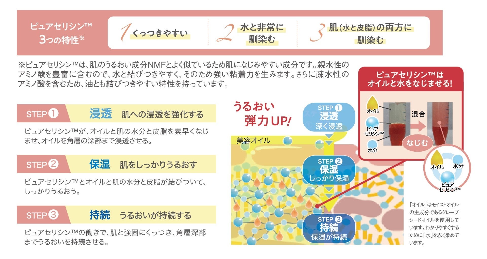①ピュアセリシン™※1が「浸透」※2「保湿」「持続」させ、 うるおう力を高めた美容オイル