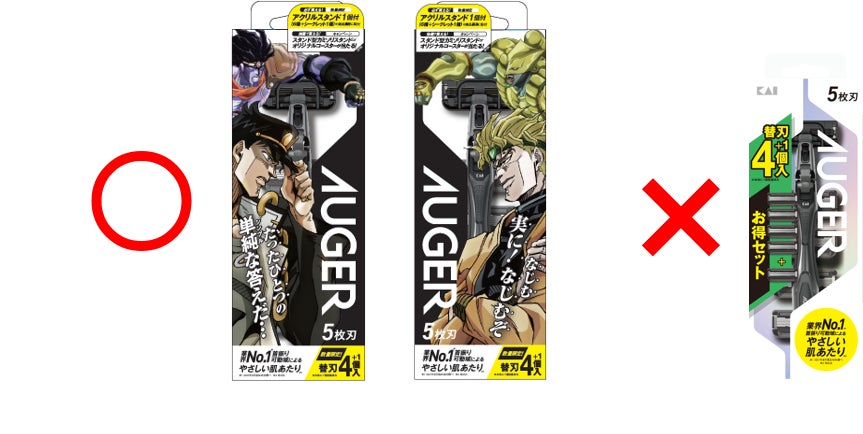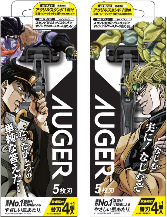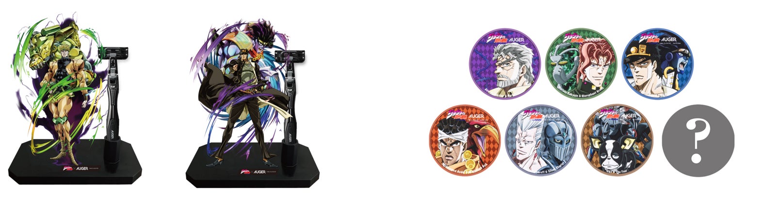 貝印の最高スペック刃体を採用したAUGERシステムカミソリに、アニメ「ジョジョの奇妙な冒険 スターダストクルセイダース」のキャラクターアクリルスタンドを同梱したコラボレーション商品。