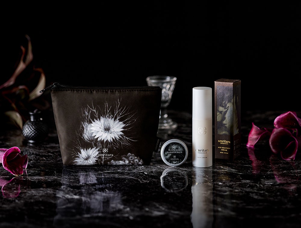 色香漂う漆黒のポーチの中心に描かれているのは、バームに配合している「ニゲラ・サティバ(ブラックシード)」です。ニゲラ・サティバの周りにはローズゼラニウムやサンザシが、ポーチの裏面にはカモミールやヤマザクラ、クロヨナ、クロモジ、柿の花が咲き誇り、アムリターラらしいボタニカルなアートをお楽しみいただけます。