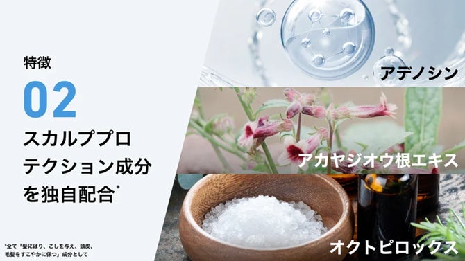 … すこやかな髪を保つのに必要な3つ成分、アデノシン・オクトピロックス・アカヤジオウ根エキスを独自配合した「スカルププロテクション成分」です。これらの成分が頭皮に浸透することで髪にハリやコシを与え、健やかに保ちます。