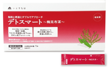 年齢とともに基礎代謝量は下がるため、消費エネルギーが減少します。そのため、以前と変わらない食事量や食生活、ライフスタイルを送っていると、摂取エネルギーの割合が増えて、それが脂肪として蓄積されやすくなります。事実、加齢とともにおなか周り、特に内臓脂肪が増える傾向にあることが分かっており、見た目だけでなく健康リスクにも繋がってきます。また、加齢とともに、お通じの悩みをかかえる方も増えると言われており、お通じは女性の悩みのイメージが強いですが、女性だけでなく実は男性でも増えてくるとされており、おなかの脂肪※1と便通※2の両方のケアができないかと考え、一緒にアプローチできる商品として、「デトスマート~梅昆布茶~」を開発しました。