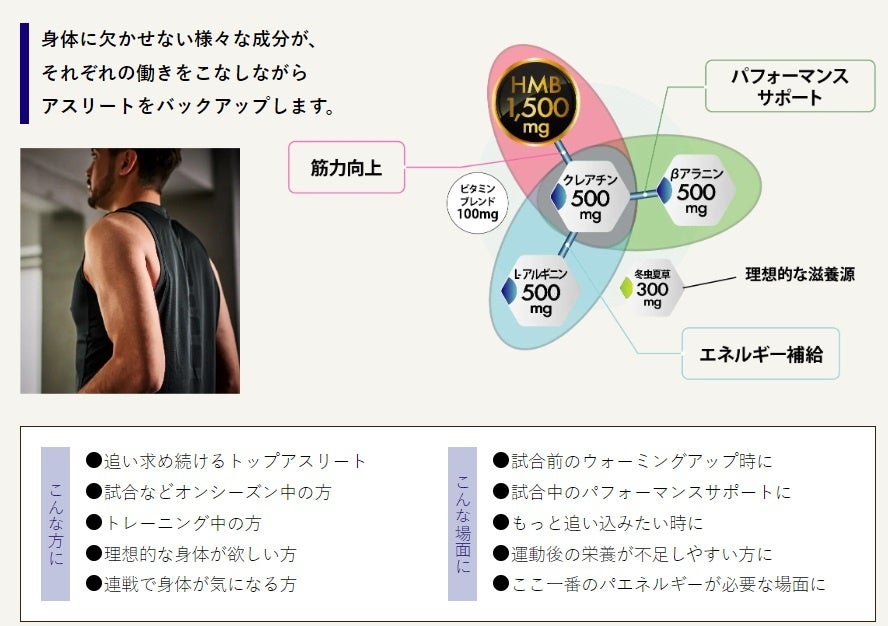国産HMB・クレアチン・Lアルギニン・βアラニン+冬虫夏草配合でアスリートの筋力向上・パフォーマンスをサポート