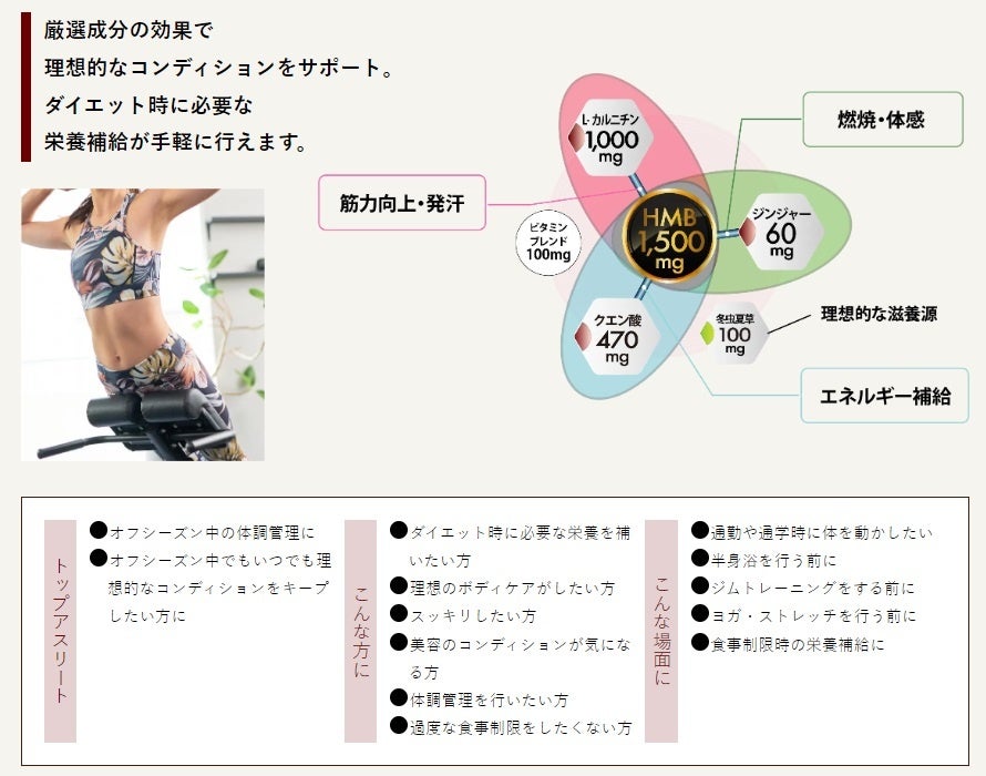 国産HMB・L-カルニチン・ジンジャー+冬虫夏草配合で燃焼サポート・ボディメイクをサポート