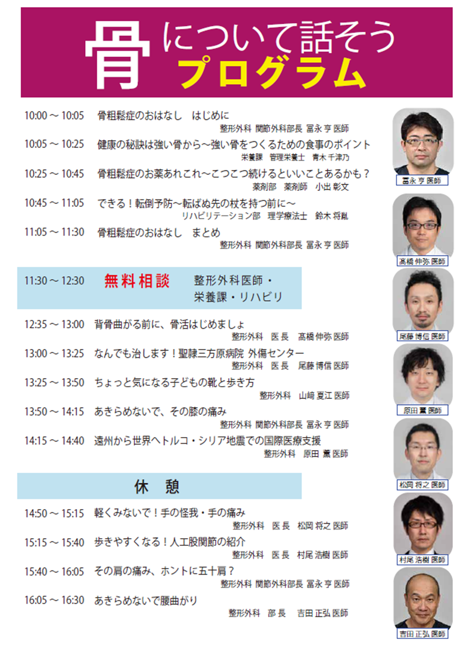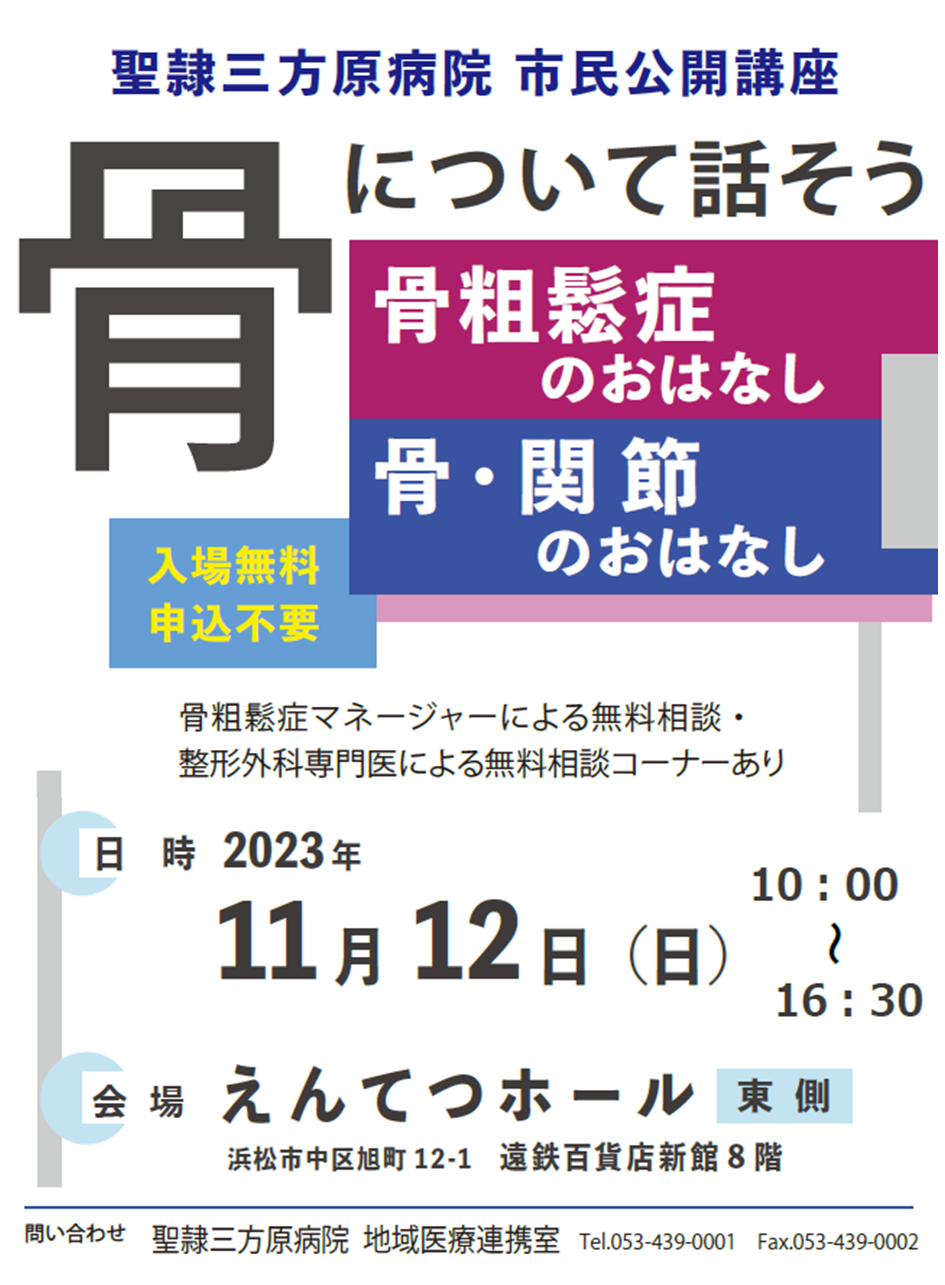 【入場無料・申込不要】11月12日(日)に聖隷三方原病院市民公開講座「骨について話そう」をえんてつホールにて開催します
