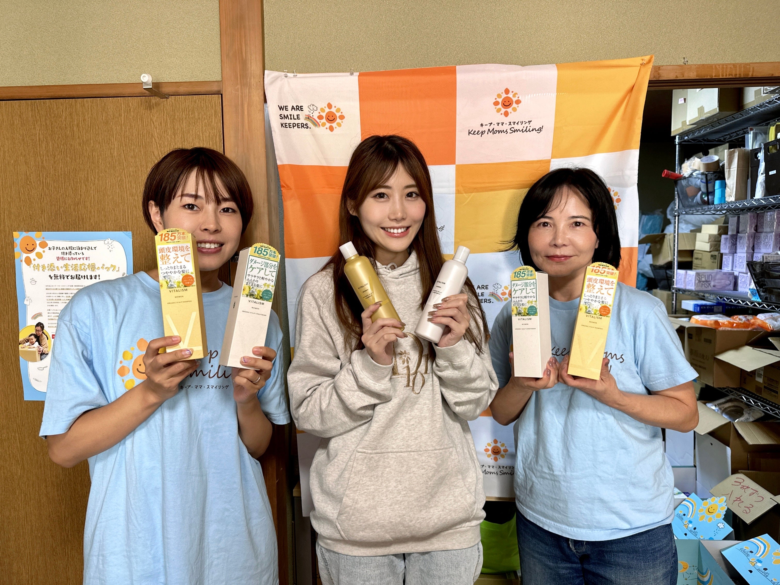 NPO法人「キープ・ママ・スマイリング」様は全国の病気の子どもを育てるお母さん・ご家族が笑顔でいられるように活動されています。活動のひとつである、「付き添い生活応援パック」は病気の子どもと付き添い入院されているお母さんにお届けされております。このような活動に深く感銘を受け、この度VITALISMの製品を寄付させていただきました。