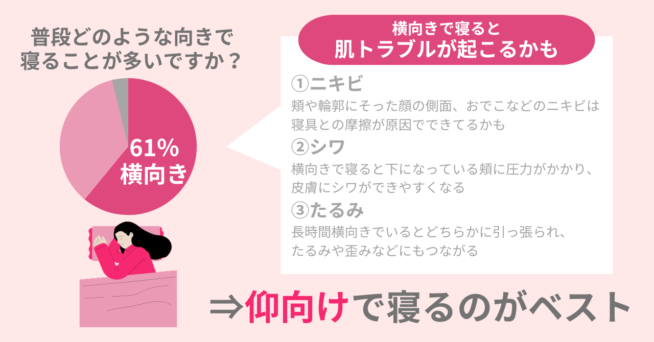 寝る向きを意識的に変えることは難しいですし、「仰向けで寝ないと」と考えすぎて眠れないと、かえって肌の調子が悪くなります。無理のない範囲で意識してみてください。