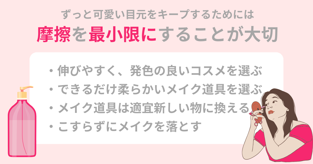 メイクによって今は可愛くなることができるかもしれませんが、数年後、目元のたるみやシワに悩み、メイクでは対処できなくなるかもしれません。今日から「摩擦を最小限にする」ことを意識しましょう!