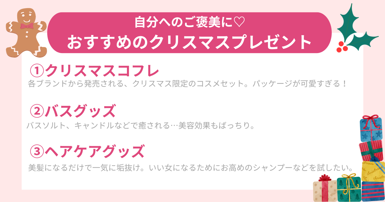 クリスマスプレゼントを自分自身のご褒美として購入し、いつもとは違う特別な1日にしてみるのはいかがでしょうか。