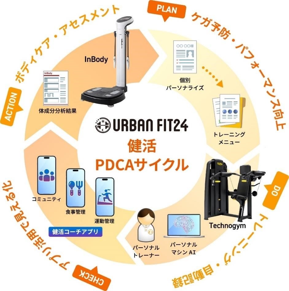 「URBAN FIT24」は最低限の内装・マシンを並べるだけの従来型24時間フィットネスジムとは異なり、会員様のライフパフォーマンス向上を目的とした、充実の設備と上質な空間、そしてホスピタリティ高いサービスをご提供しています。さらに、2022年5月に、医療介護クラウドサービス大手の株式会社カナミックネットワーク(東証プライム上場:証券コード3939)のグループ会社となったことで、ヘルスケアデータやITを活用したオリジナルの「健活コーチアプリ」や、理学療法士が監修し個々の身体に対応した運動プログラムを導入。より一層充実したサービスをご提供いたします。