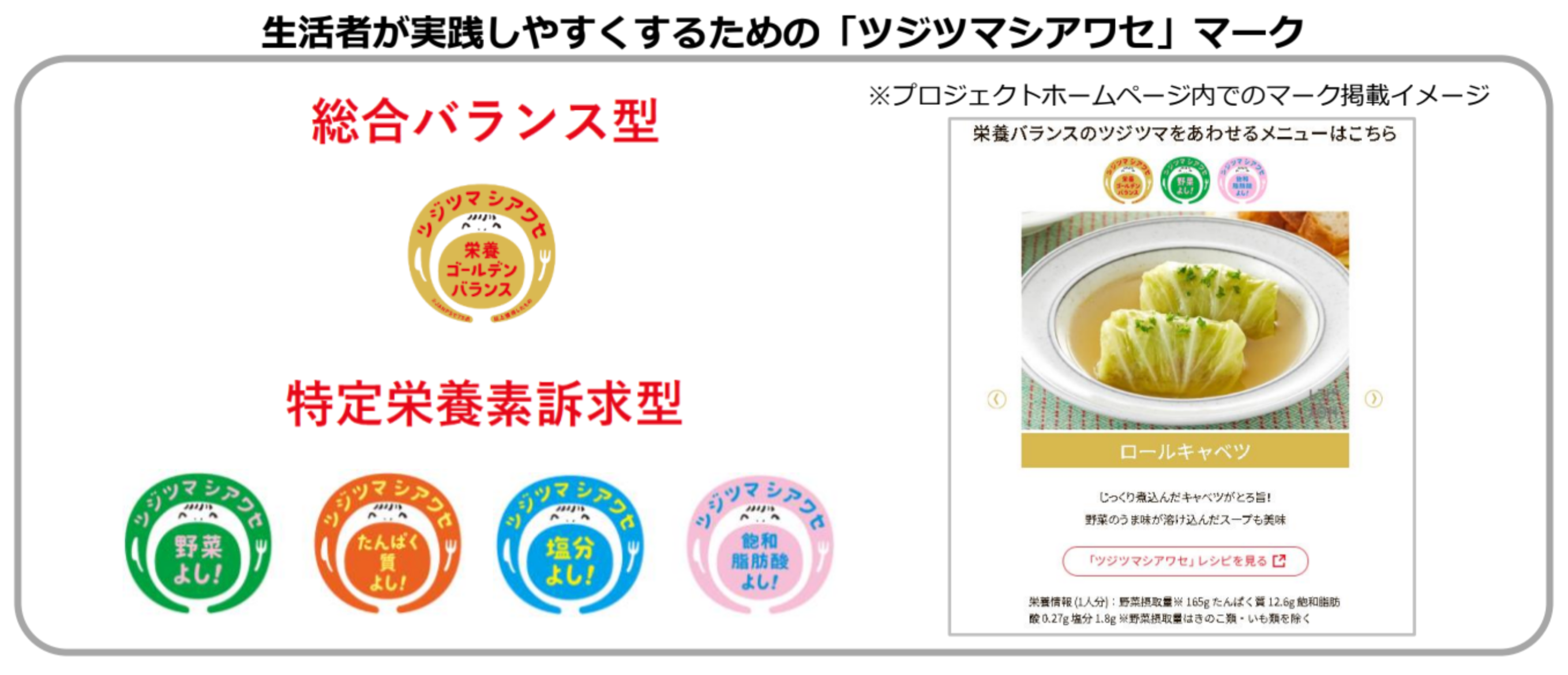 また、「ツジツマシアワセ」を生活者が日常的に実践しやすくするために、献立やメニューを選ぶ際の指標となる「ツジツマシアワセ」マークも開発しました。栄養素のことが良く分からなくても、マークを拠り所として生活者が栄養のツジツマ合わせを実現できる環境をつくります。